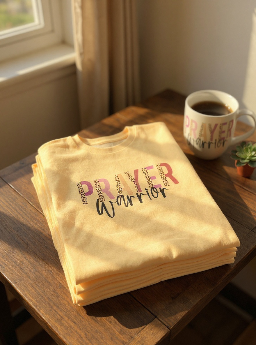 PRAYER WARRIOR Design in featured on Haze Yellow Tee. It is a soft very feminine color that accents anyone's features.