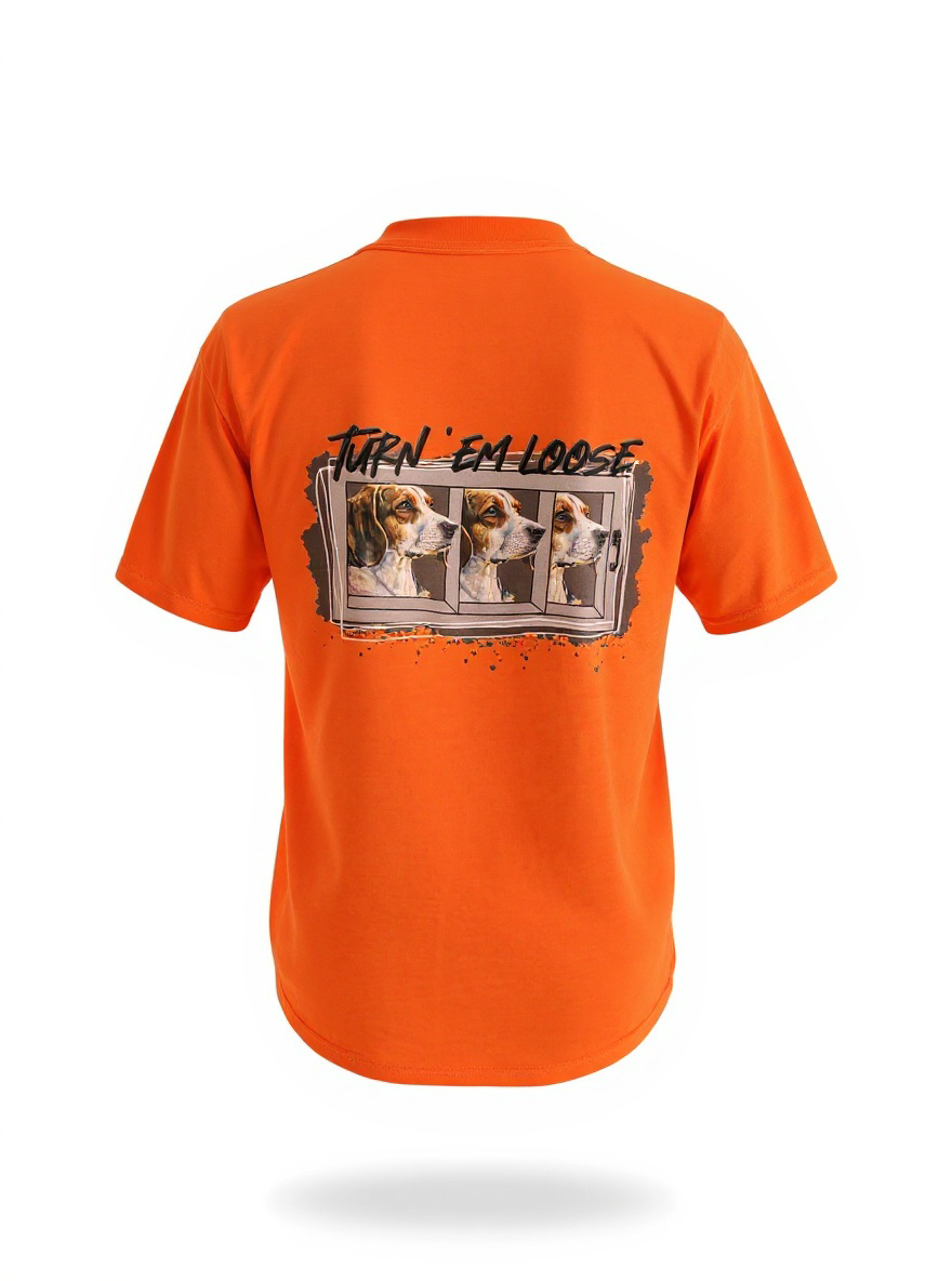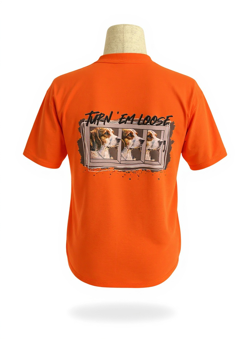 TURN ‘EM LOOSE Hunting Dogs x3 Design is printed onto a Safety Orange T-Shirt. These are especially designed for the Dog Hunters with Safety in mind. The Design is placed on the back of the shirt, unless requested on the front. With Care and Prayers these Tees are made especially for you.